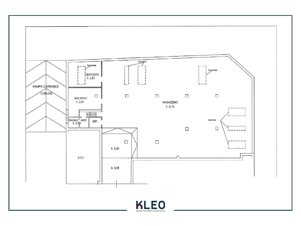 archivio, deposito, magazzino molto grande con altezza H=3.10 e ben illuminato da lucernari in vetrocemento.