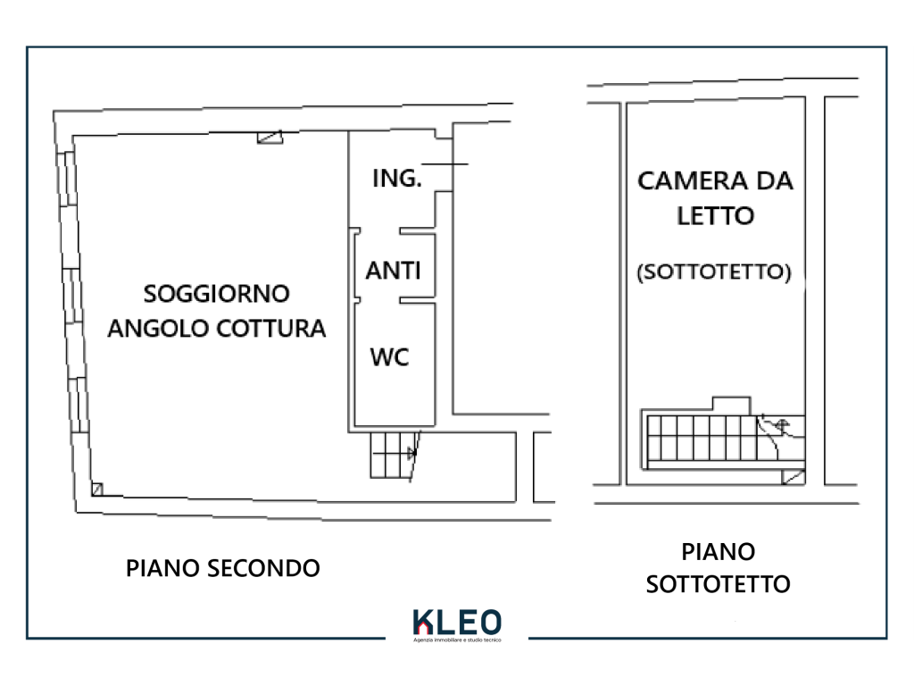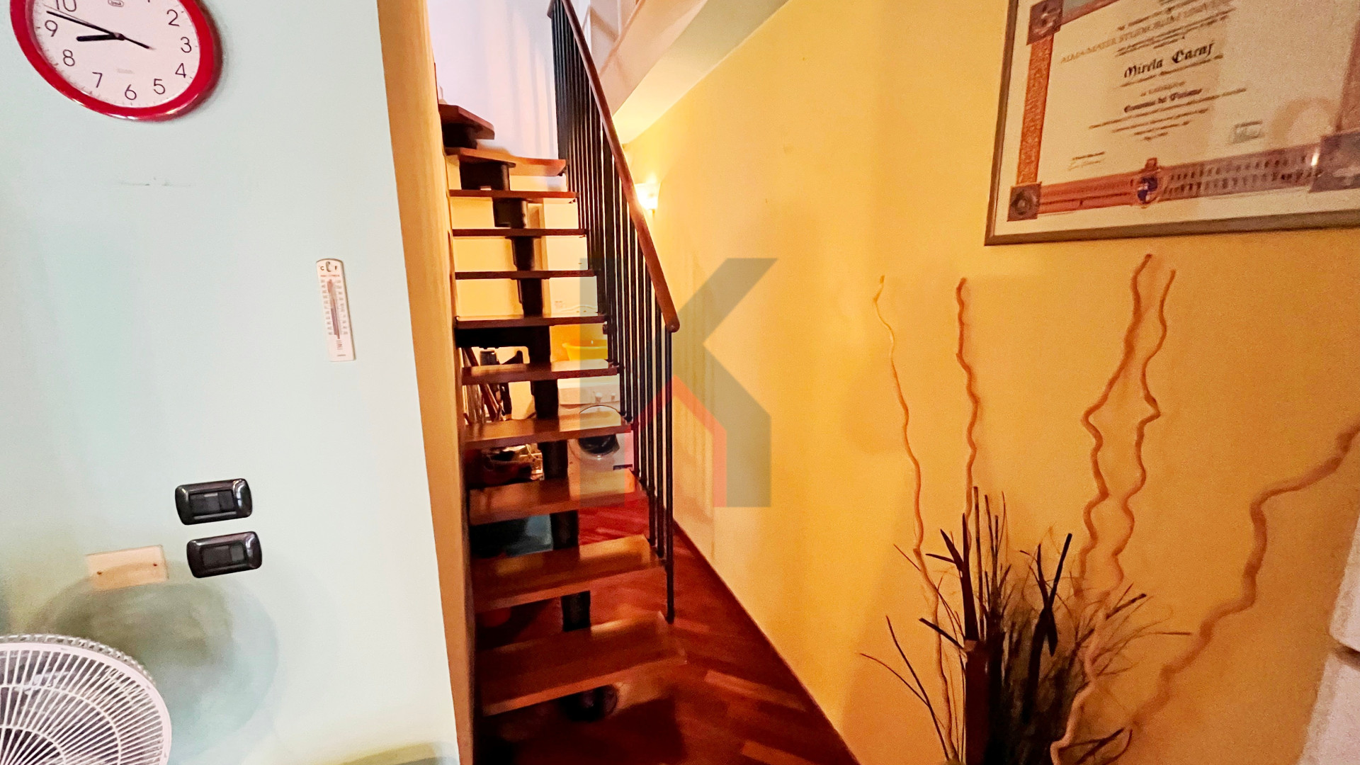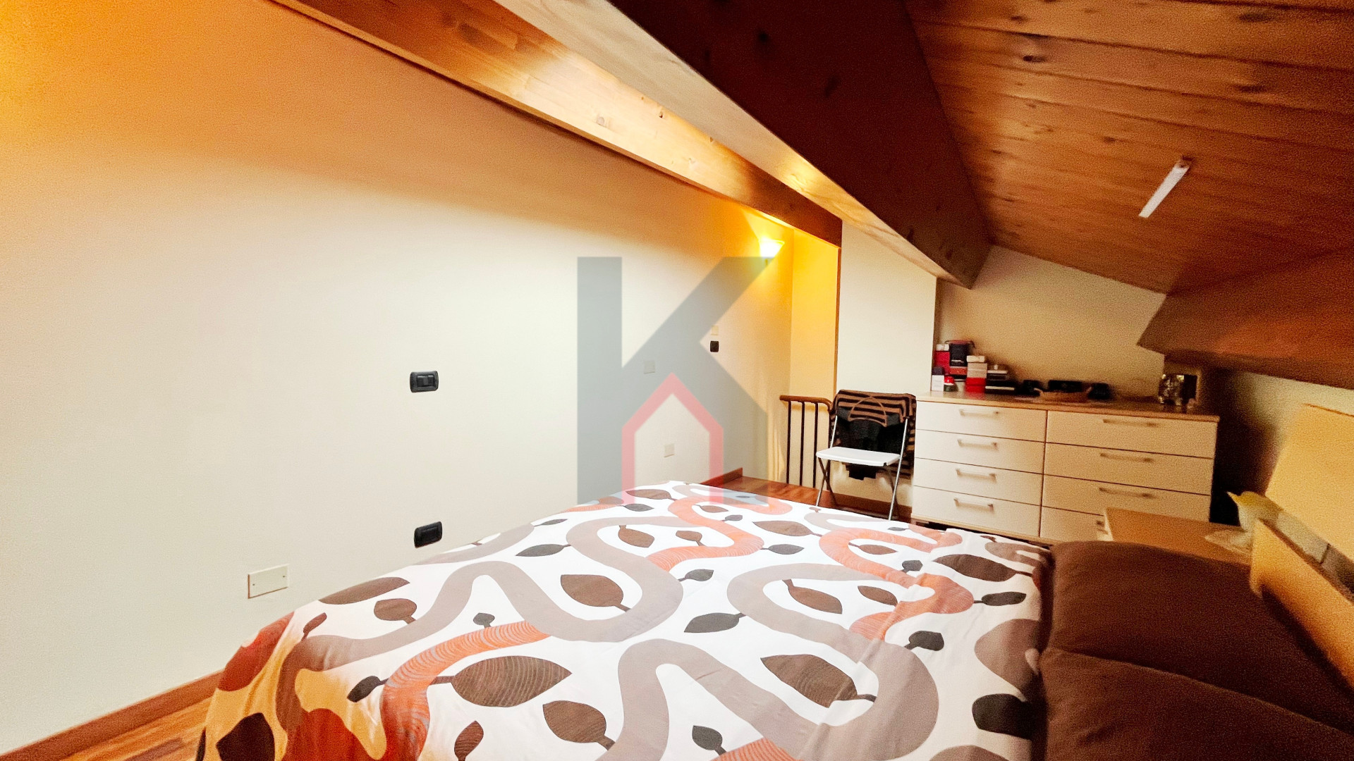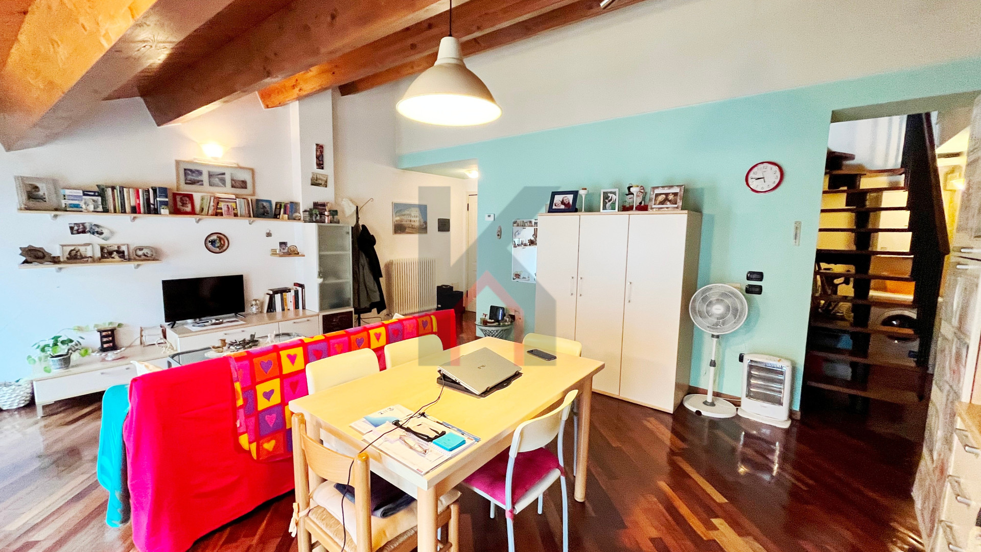 dal soggiorno troviamo una scala d'arredo in acciaio/legno che porta al piano sottotetto finestrato da lucernaio attualmente adibito come camera da letto.