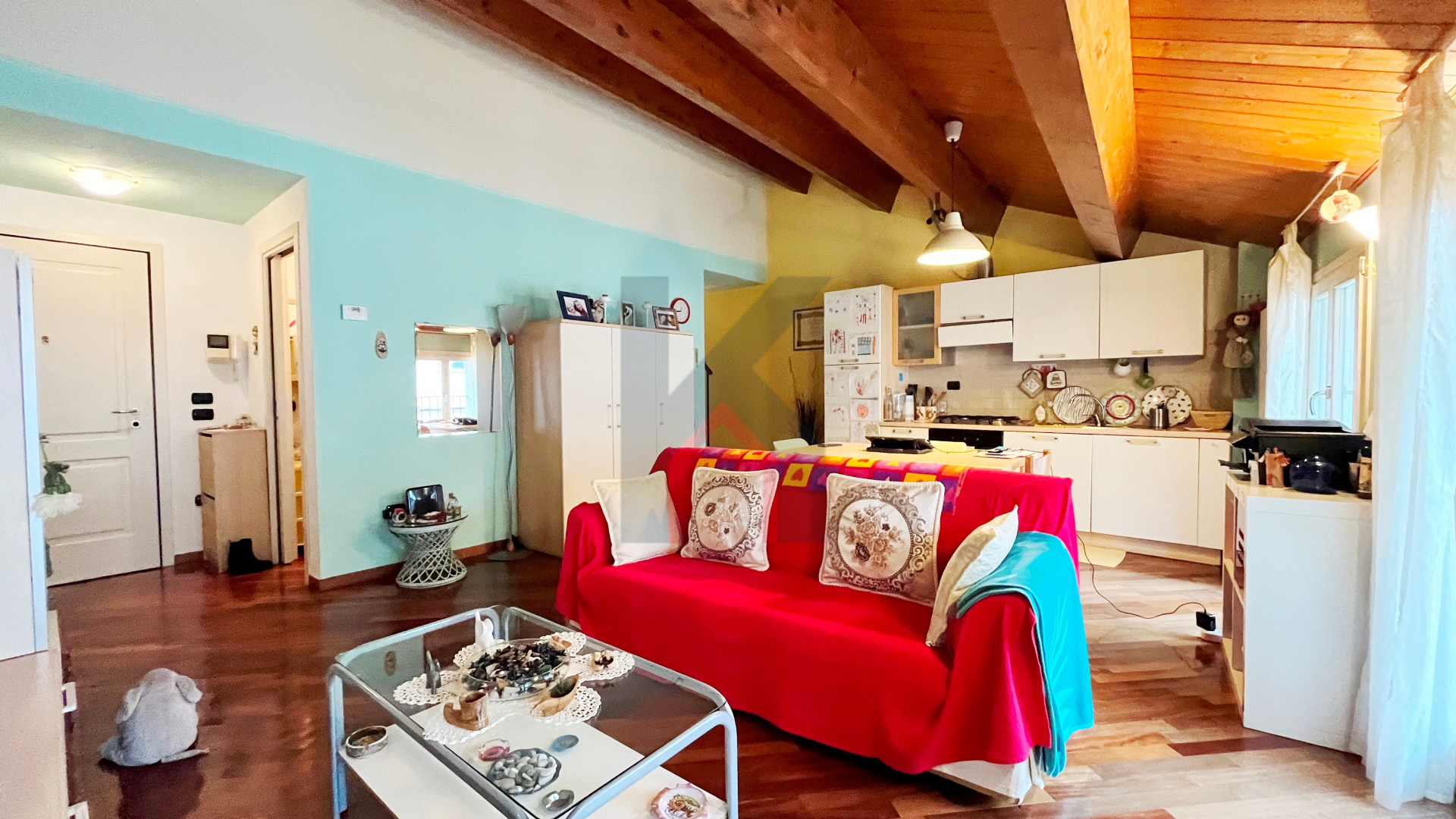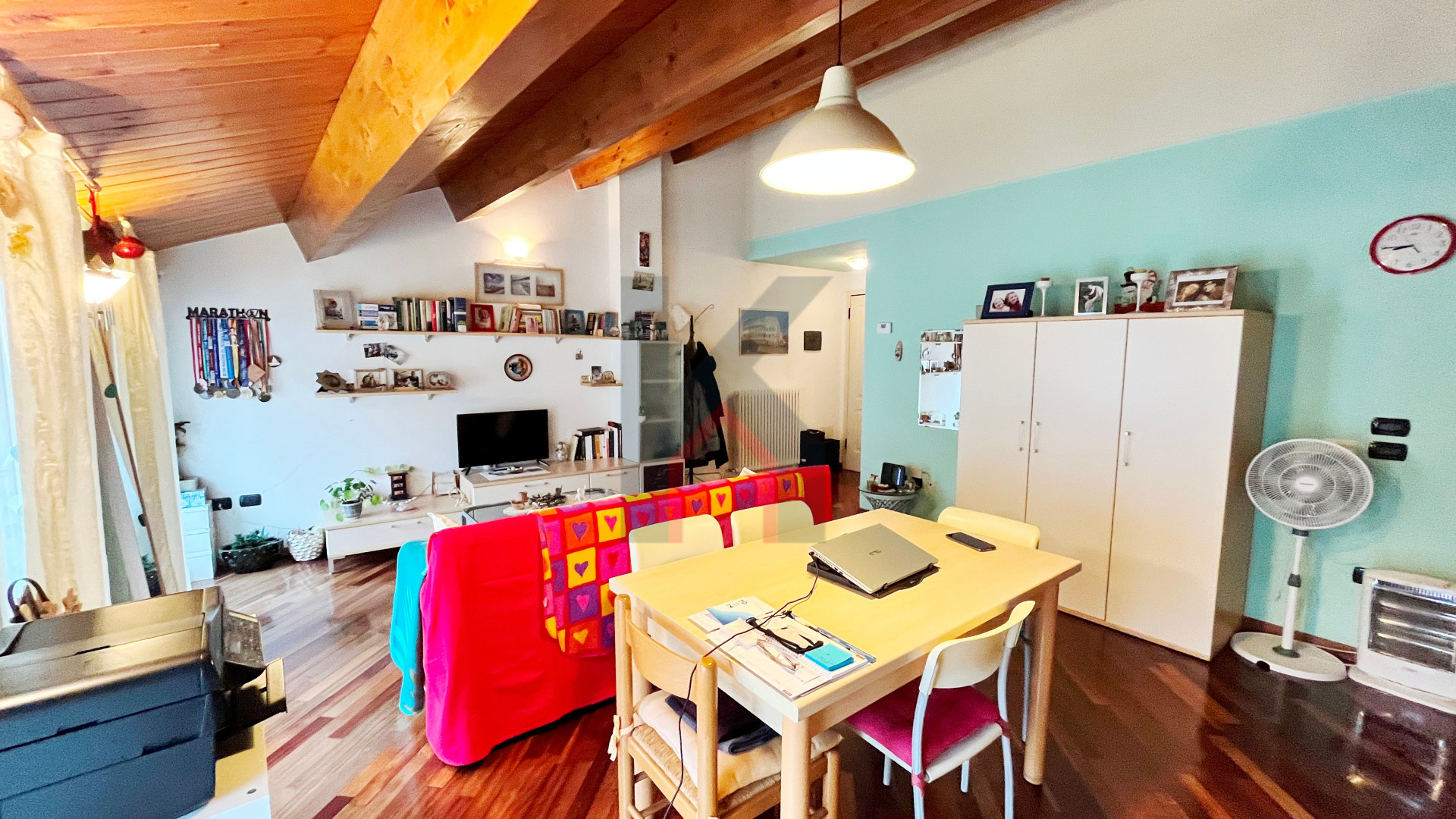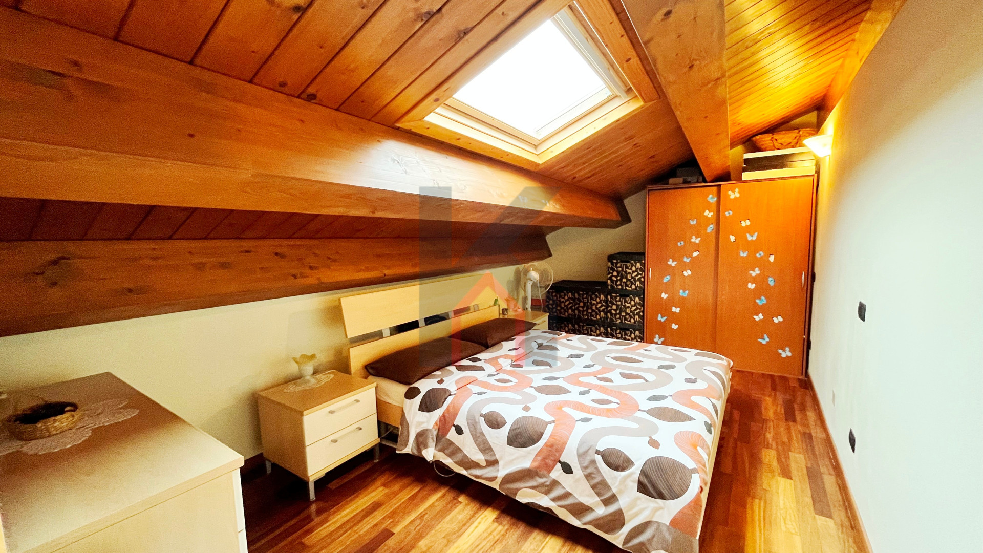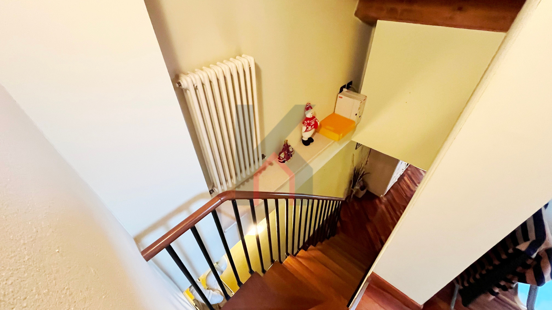 dal soggiorno troviamo una scala d'arredo in acciaio/legno che porta al piano sottotetto finestrato da lucernaio attualmente adibito come camera da letto.