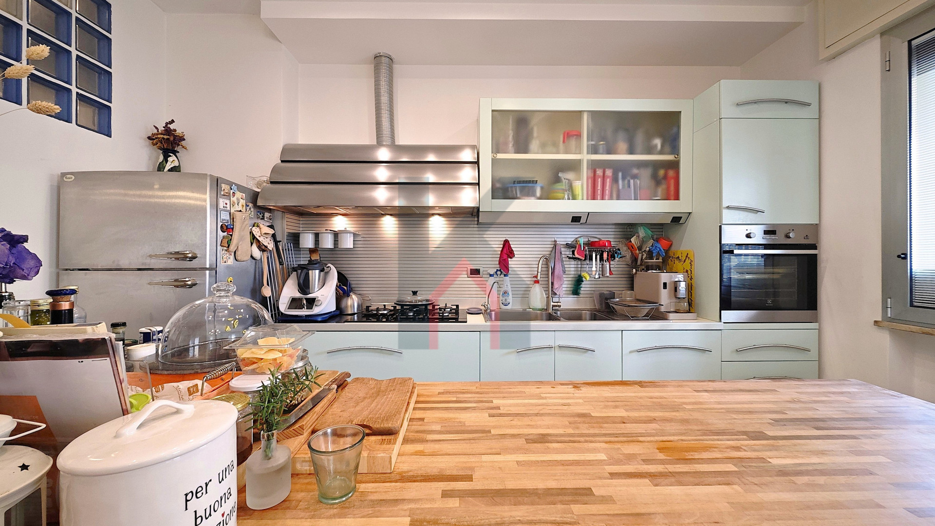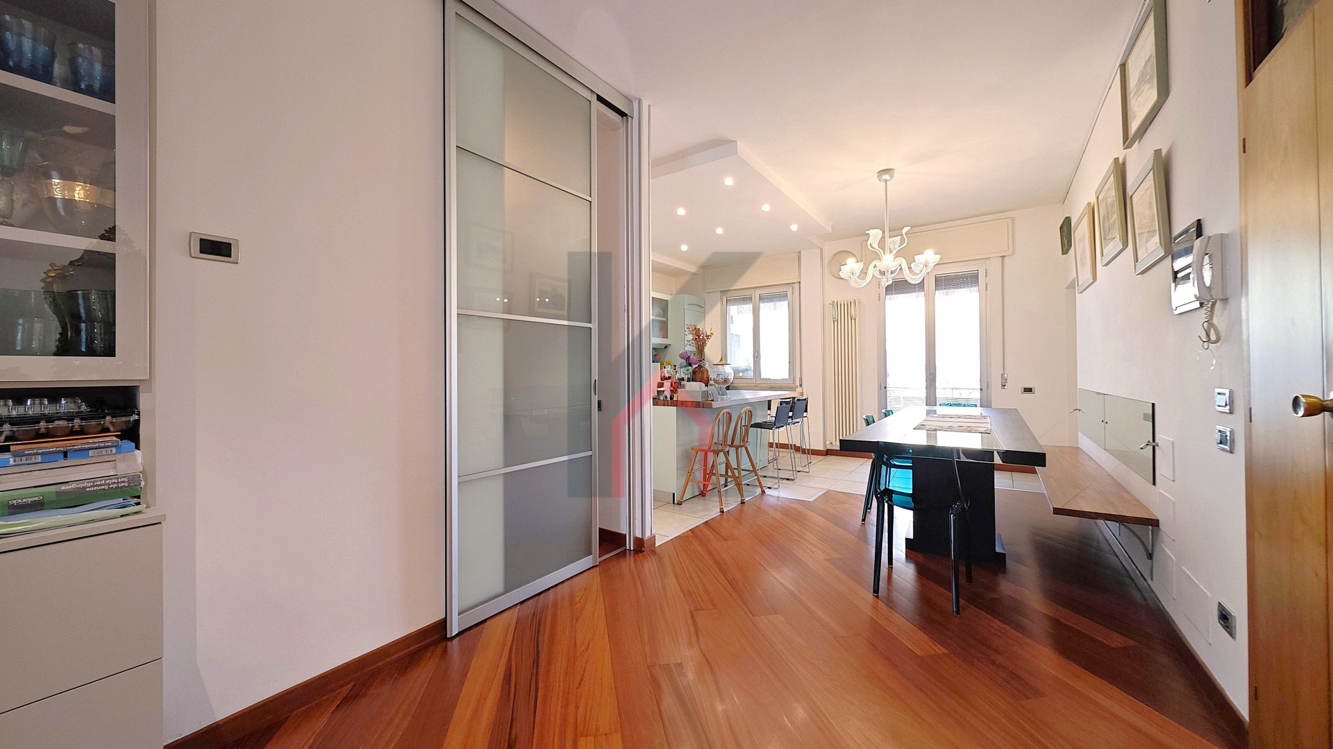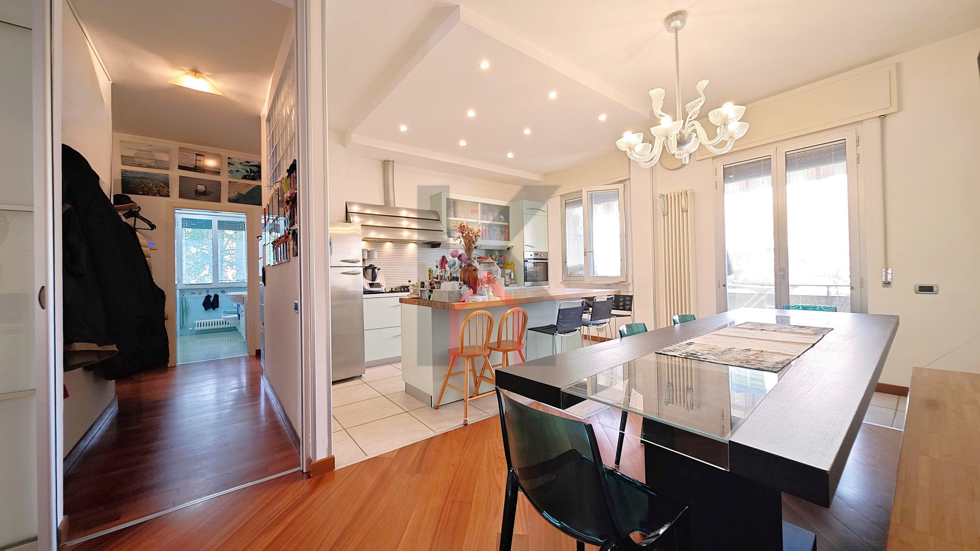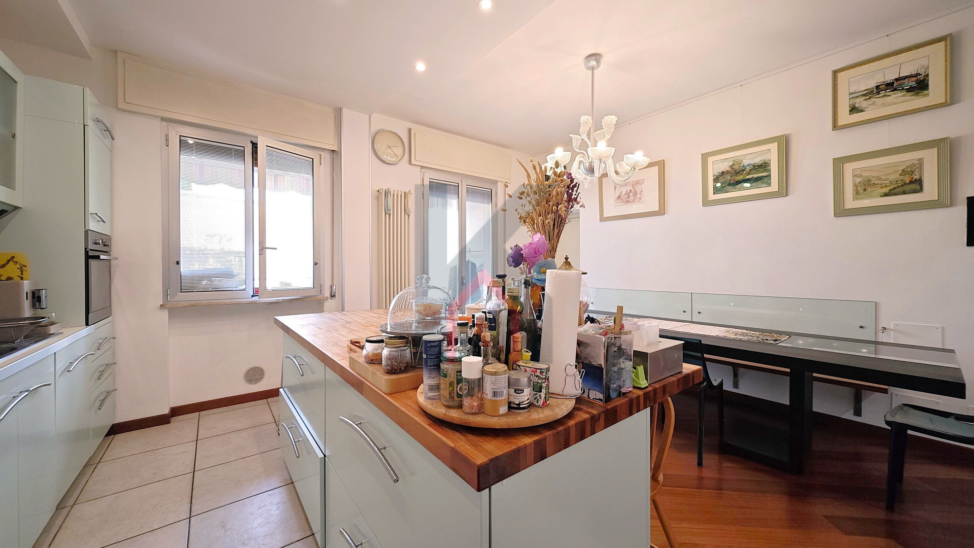 Entrando accediamo al comodo soggiorno di oltre 25 mq servito da balcone che affaccia sul fronte del caseggiato e che in continuità ci porta alla cucina abitabile anch'essa con balcone dedicato e ripostiglio/lavanderia ove è allocata la caldaia.