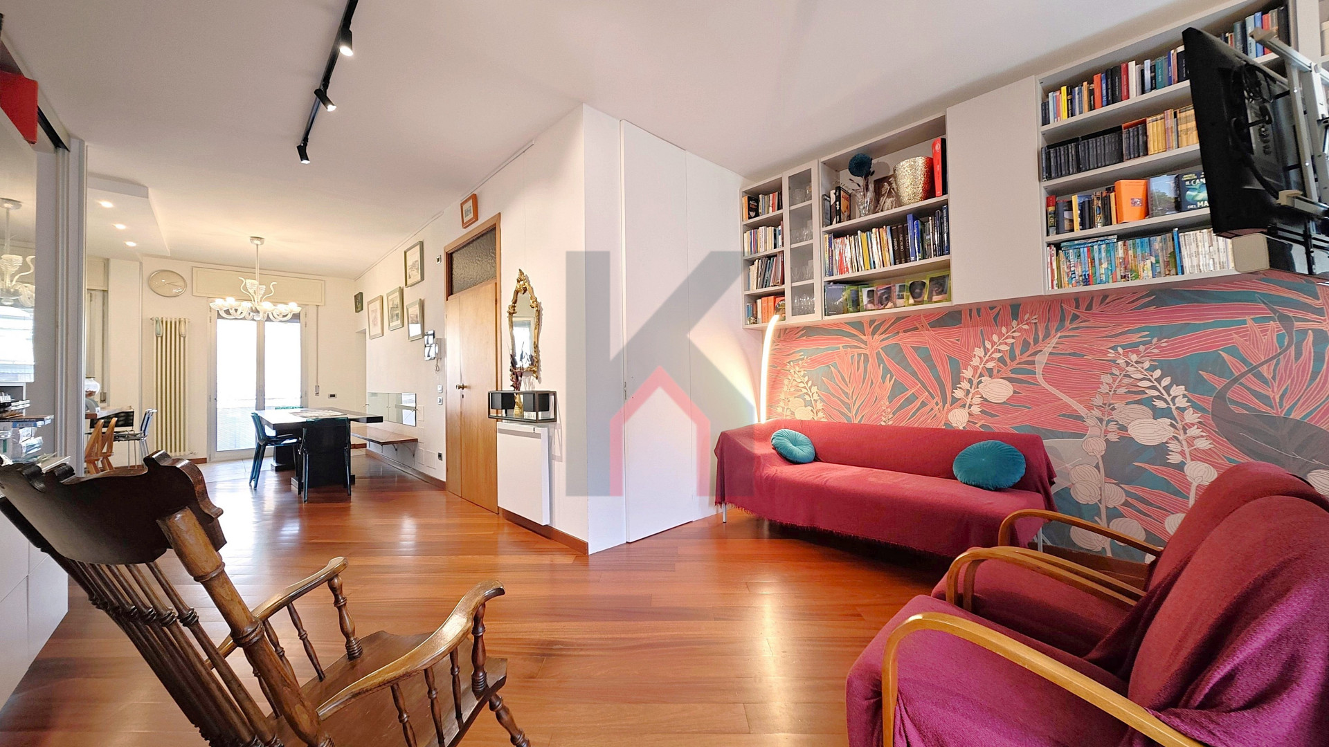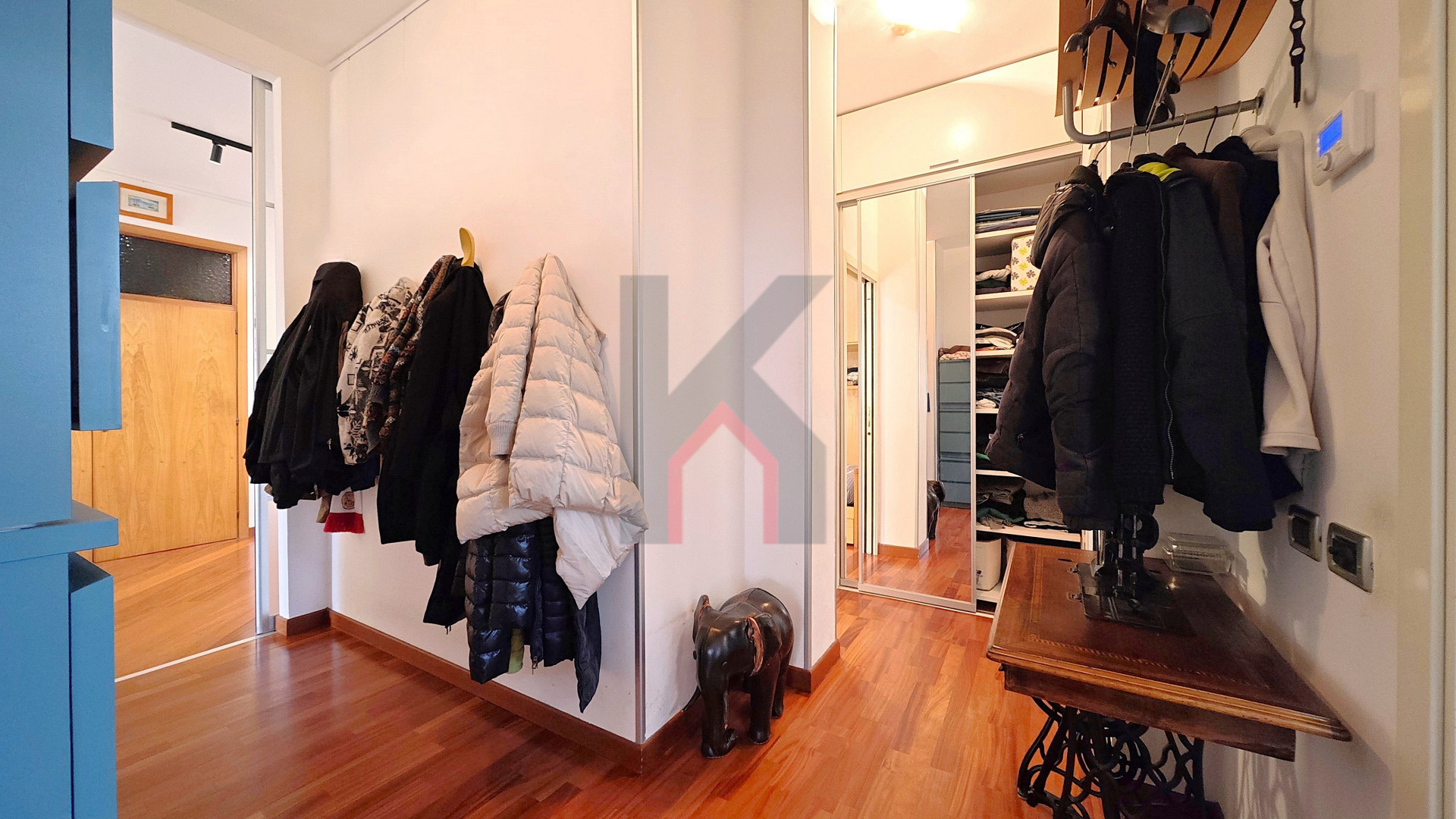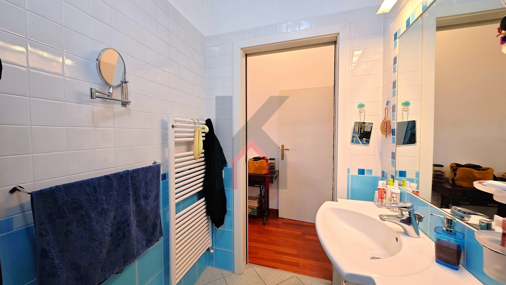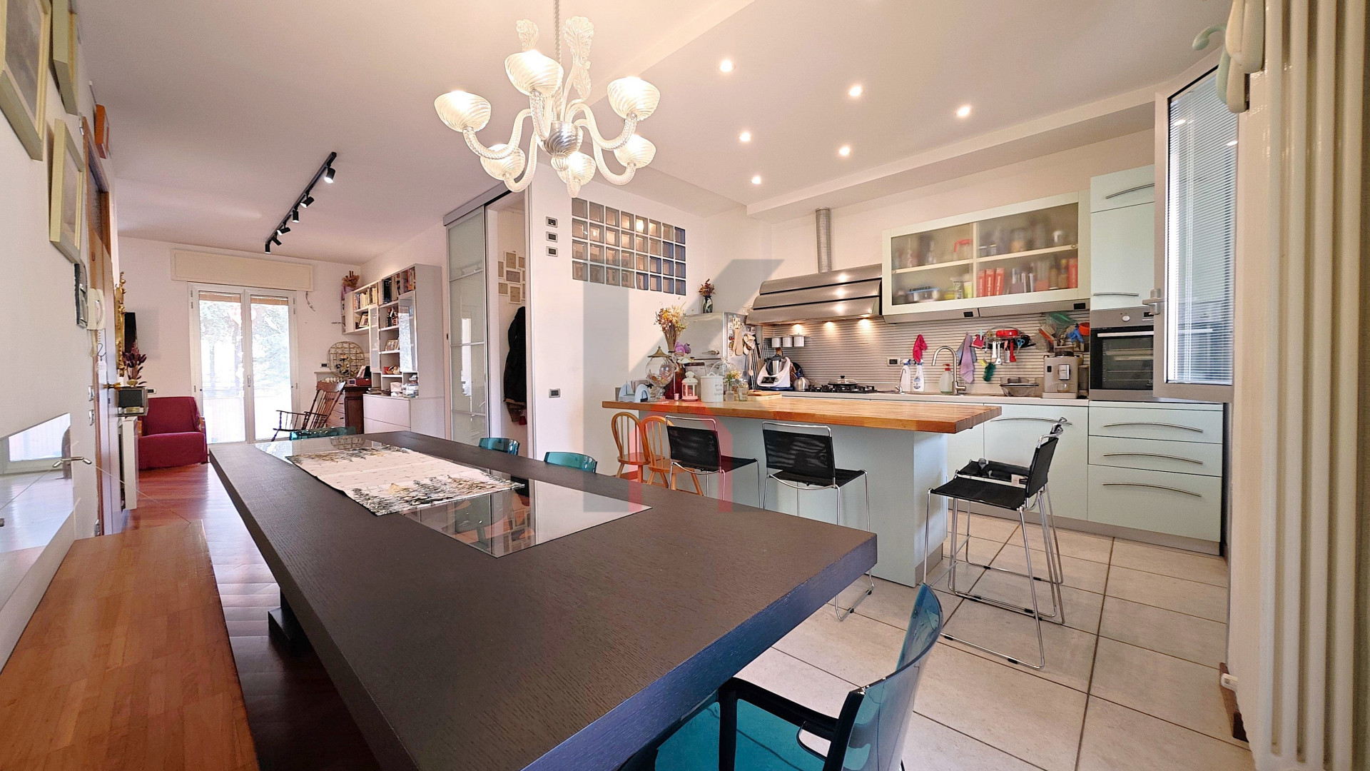Entrando accediamo al comodo soggiorno di oltre 25 mq servito da balcone che affaccia sul fronte del caseggiato e che in continuità ci porta alla cucina abitabile anch'essa con balcone dedicato e ripostiglio/lavanderia ove è allocata la caldaia.