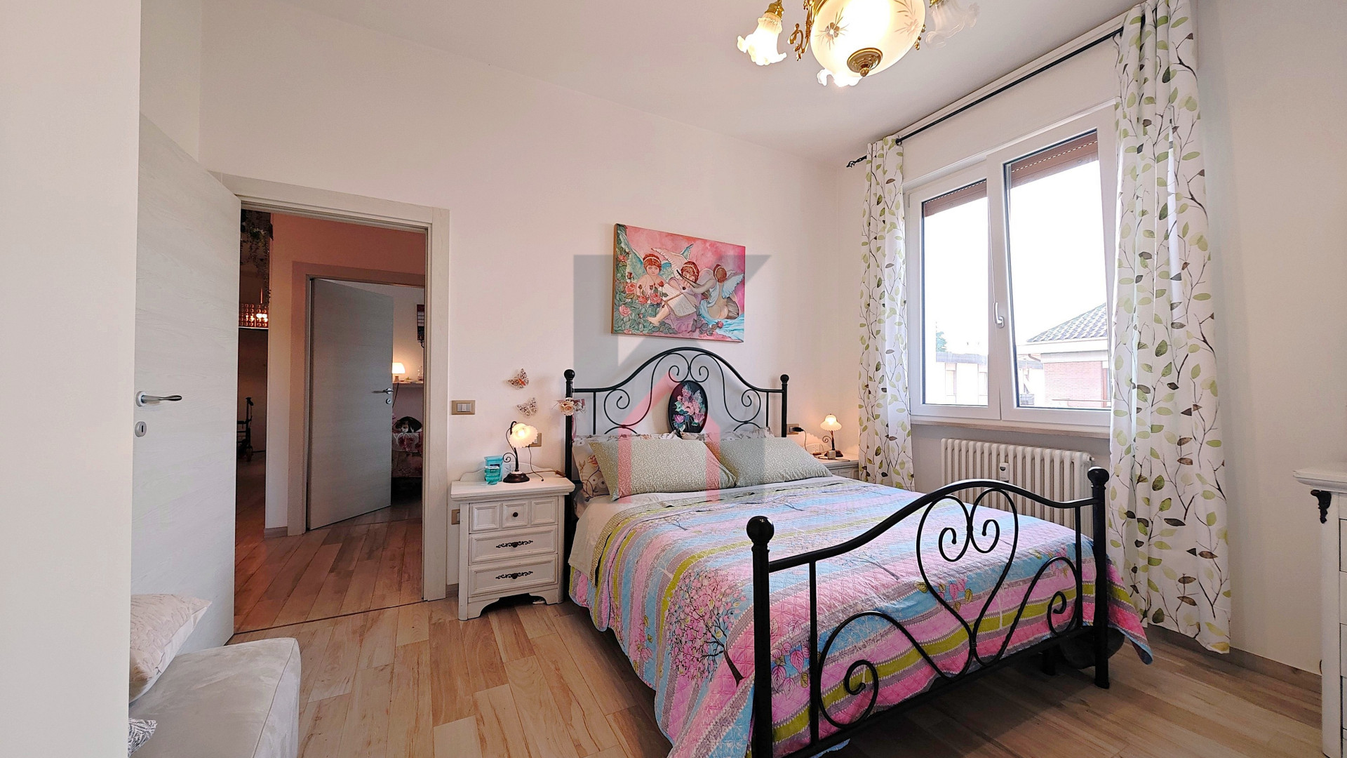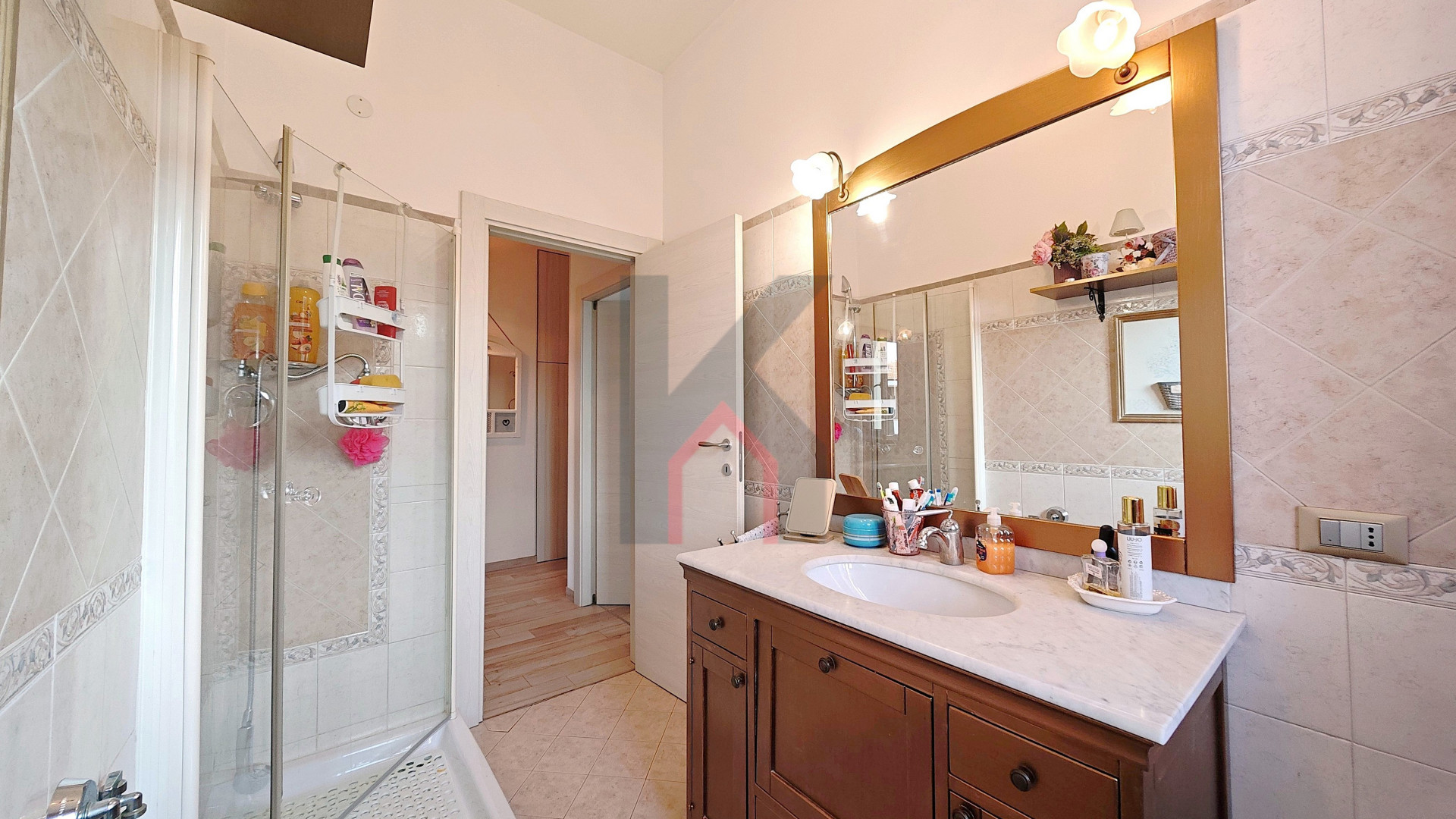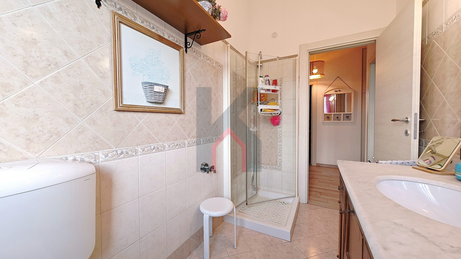 Continuando si raggiunge il disimpegno che ci permette l'accesso alle due camere da letto matrimoniali, una delle quali con affaccio su terrazzo, una terza cameretta usata come camera da letto, il bagno finestrato con box doccia e il bagno di servizio con doccia in muratura.