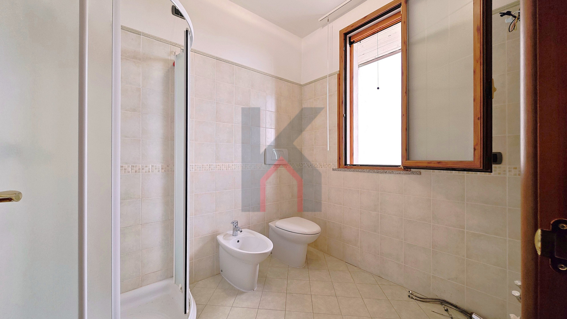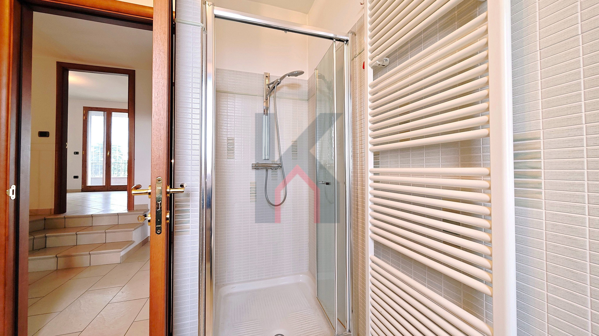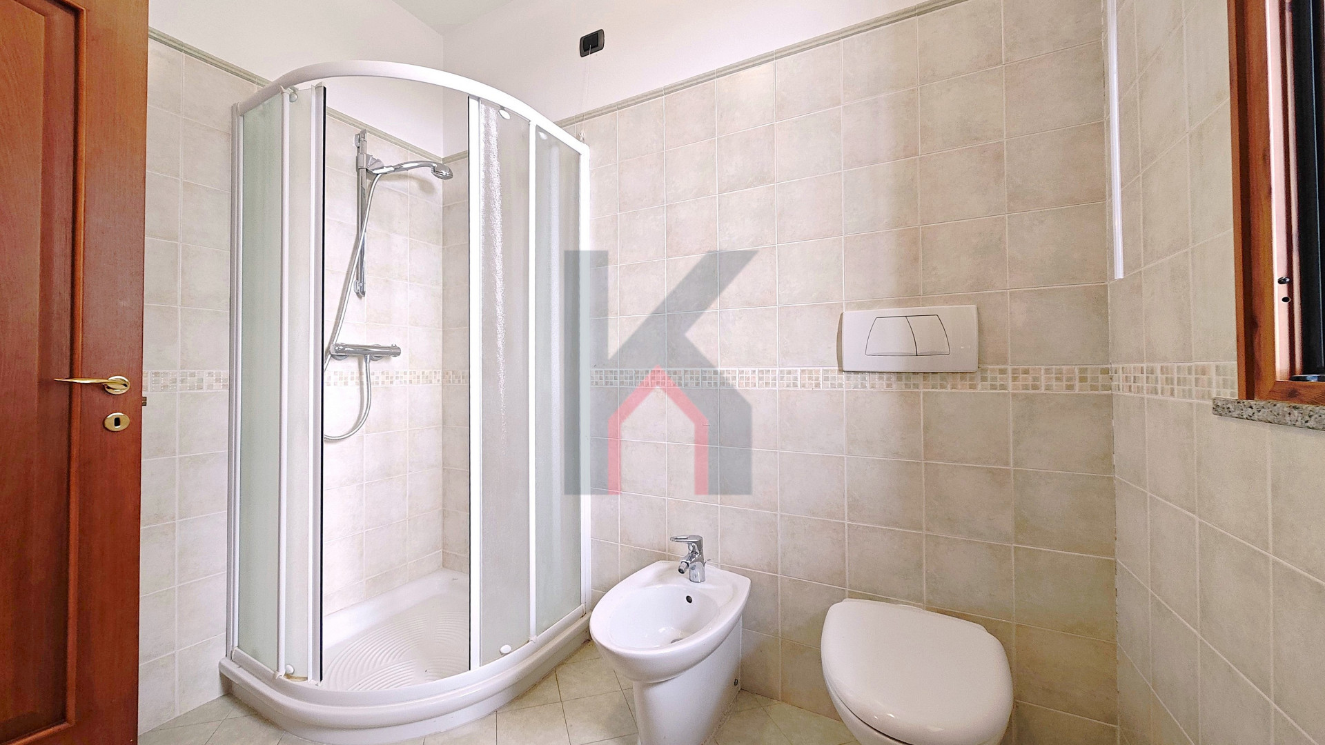 Superata la porta blindata troviamo un ampio ingresso dal quale possiamo accedere al soggiorno e alla cucina abitabile entrambi con portefinestre che danno sul portico e al primo bagno finestrato con box doccia.
