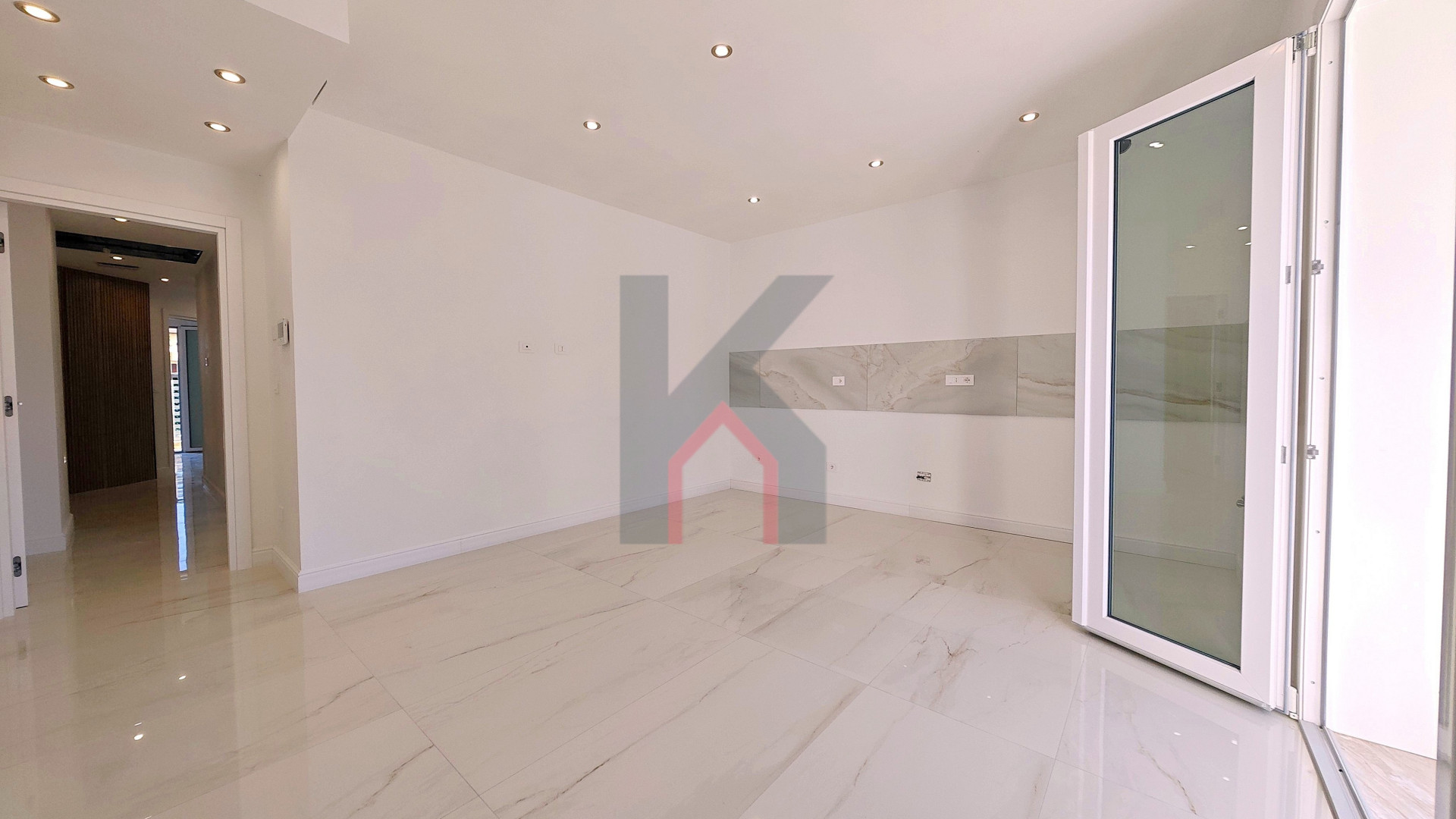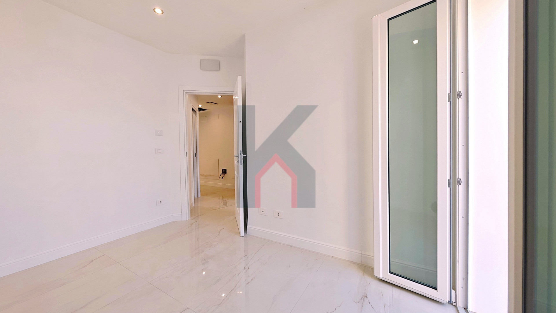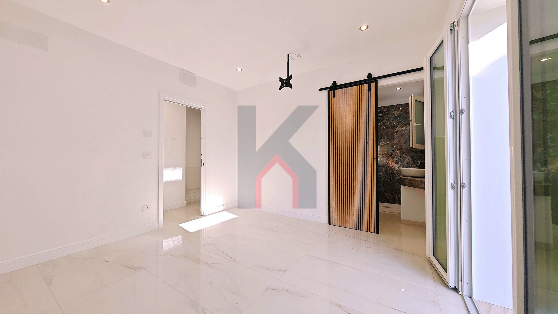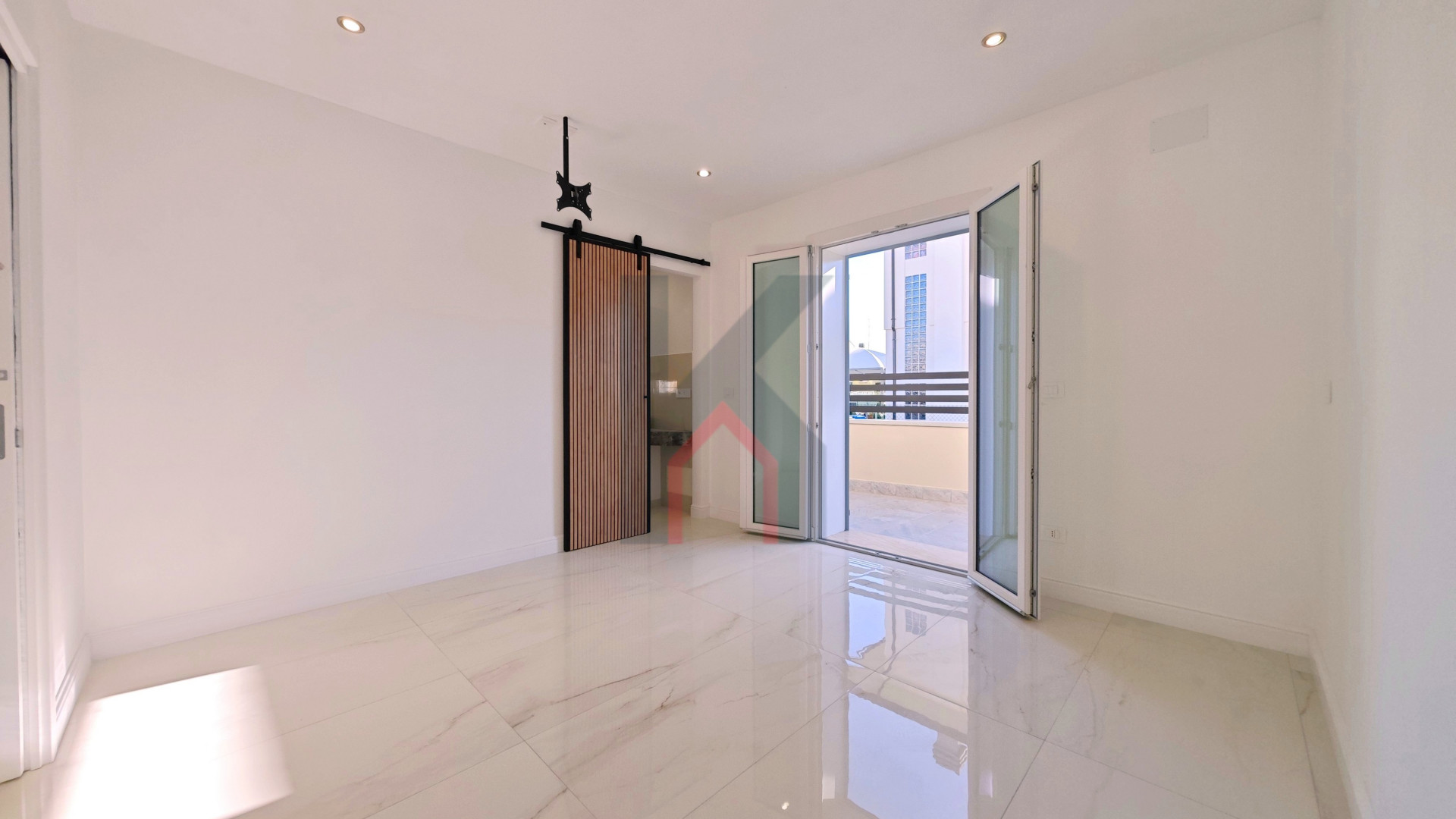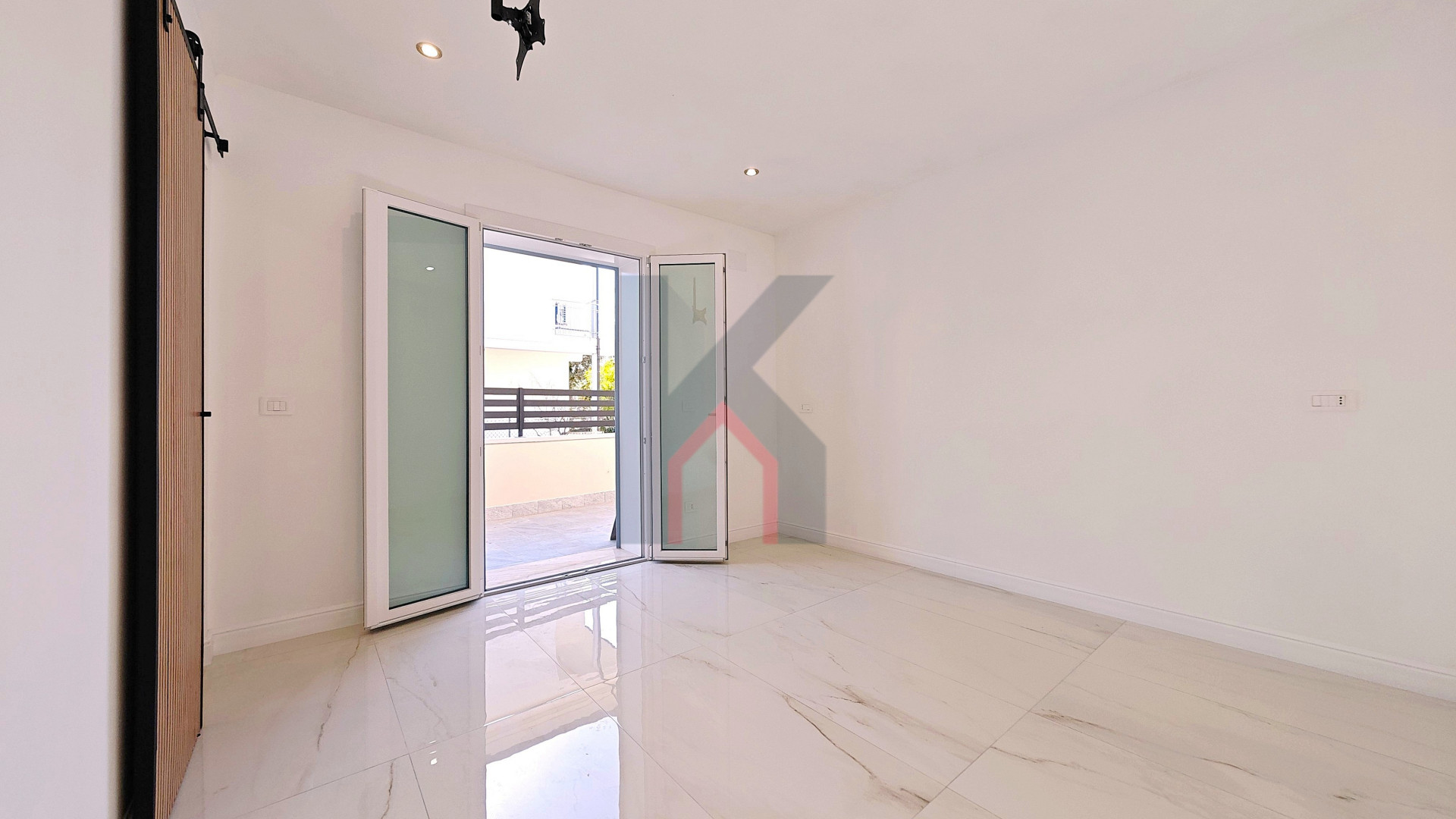 L'ingresso è tramite portafinestra blindata che dà sul soggiorno con angolo cottura predisposto per la cucina ad induzione;
