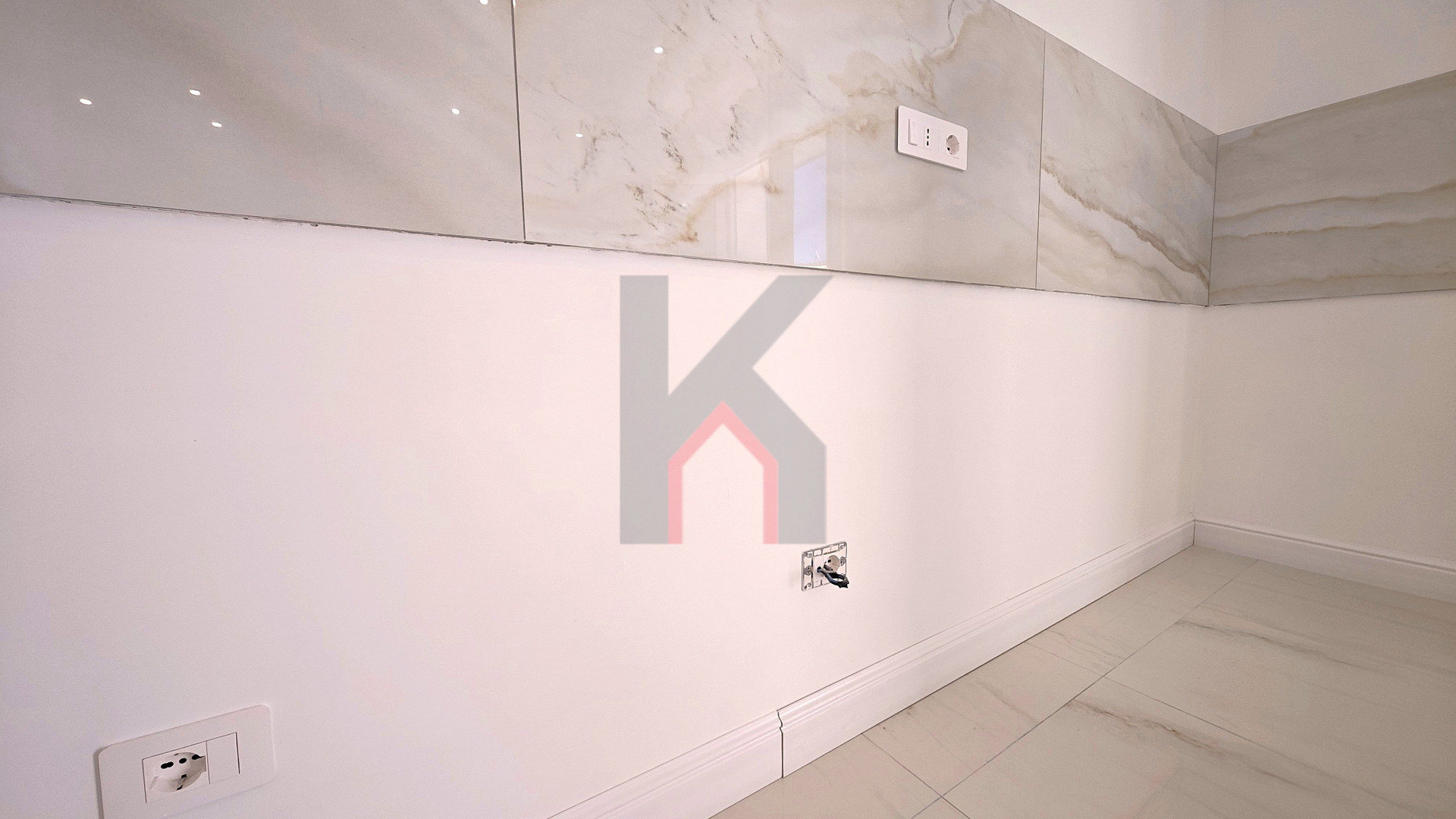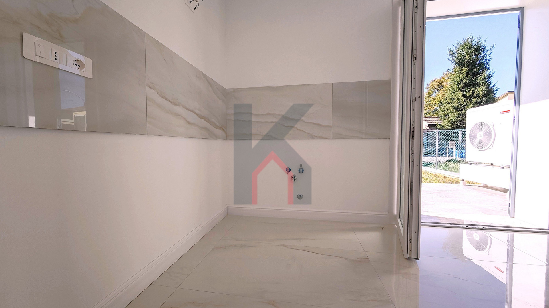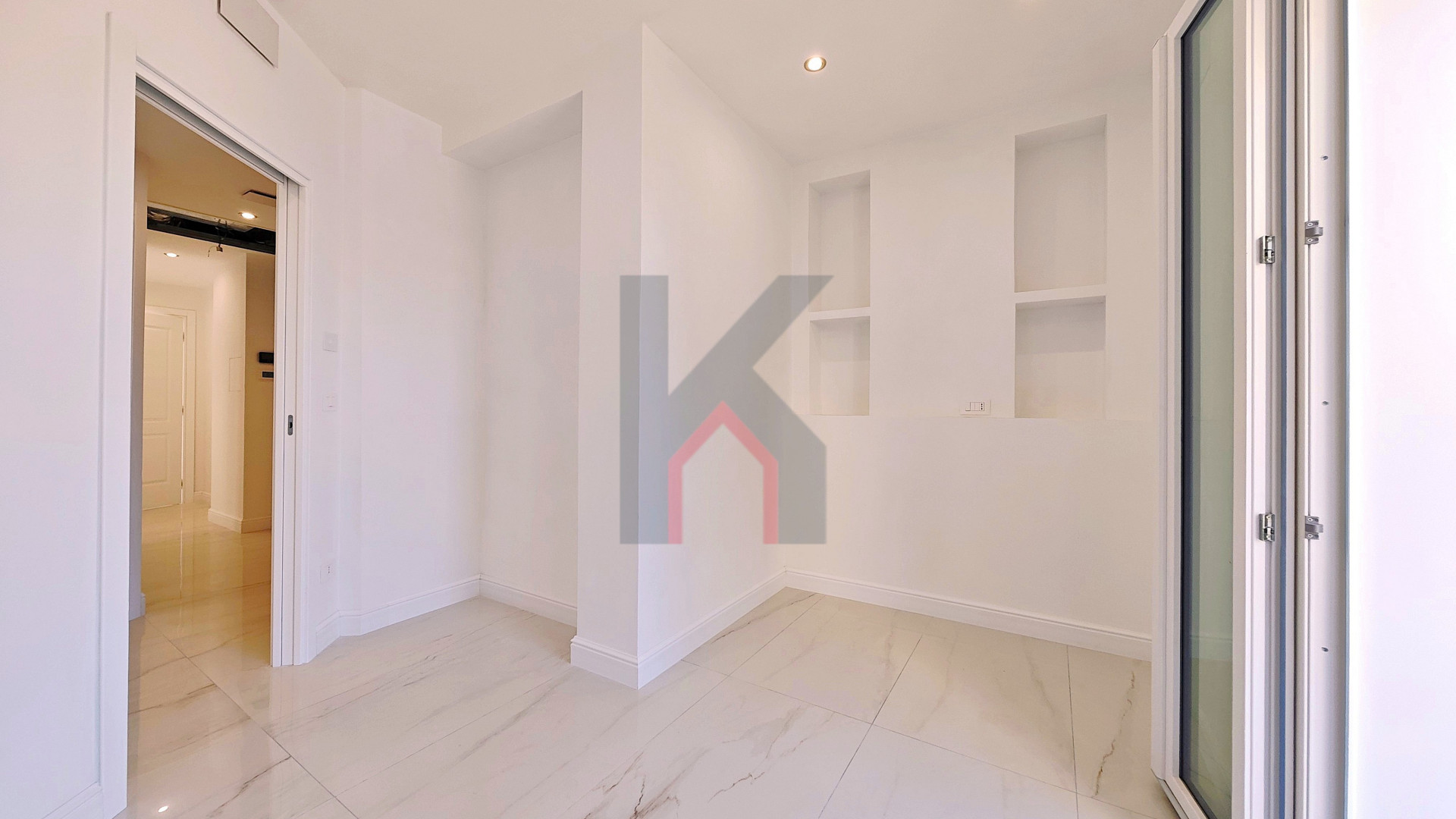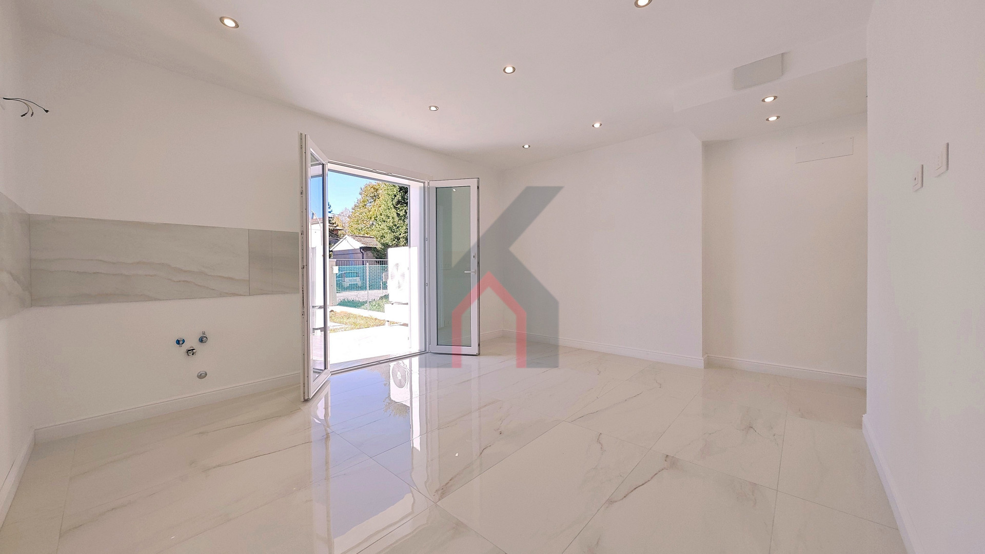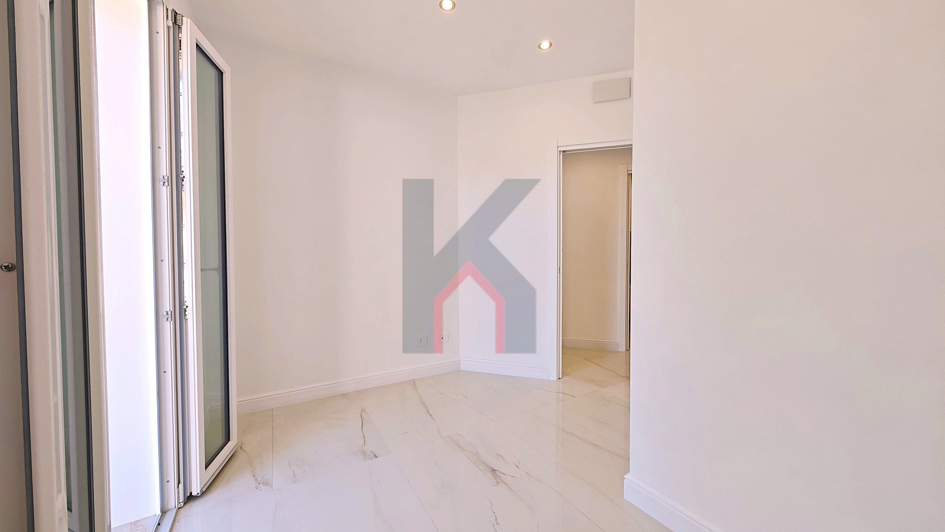 L'ingresso è tramite portafinestra blindata che dà sul soggiorno con angolo cottura predisposto per la cucina ad induzione;