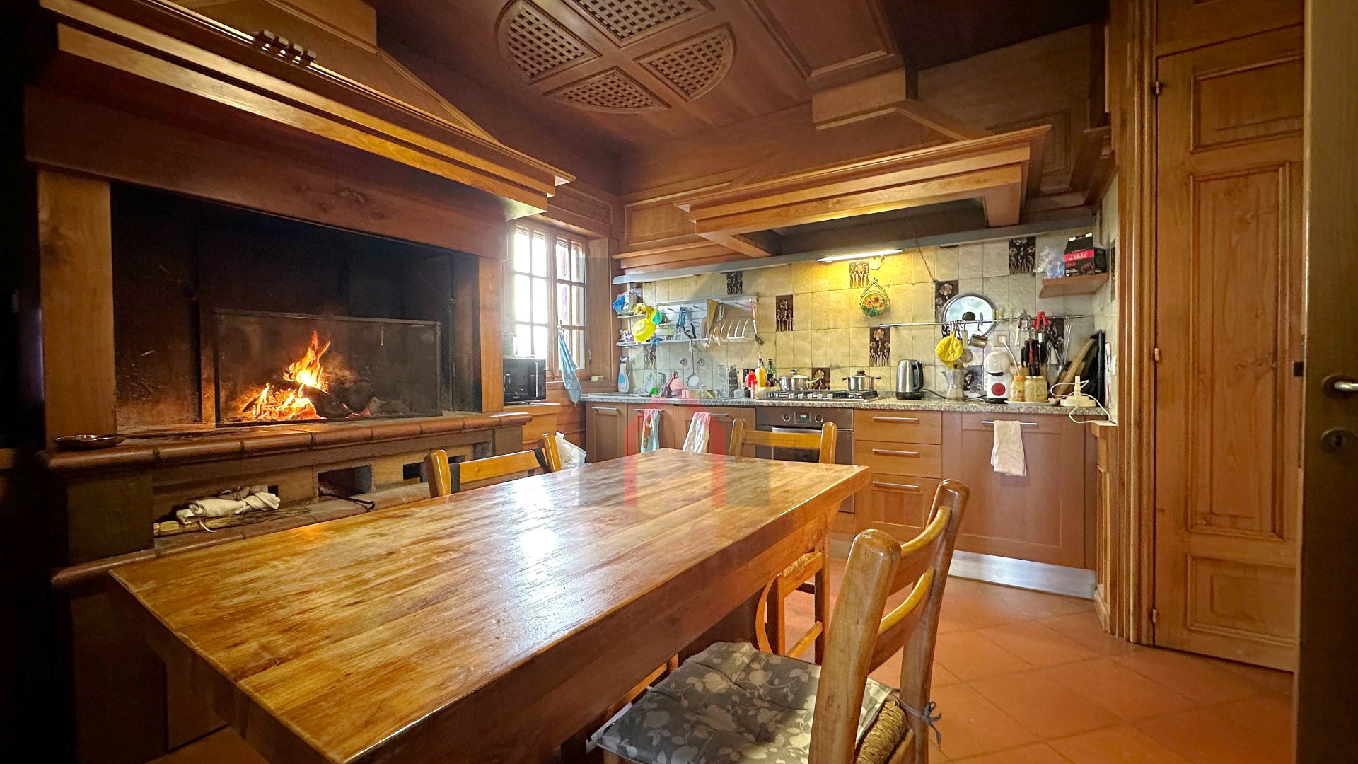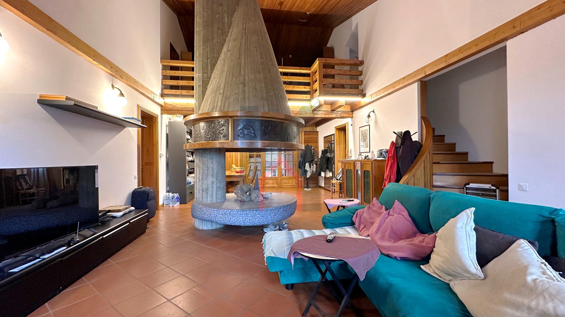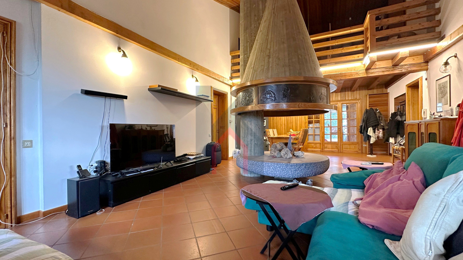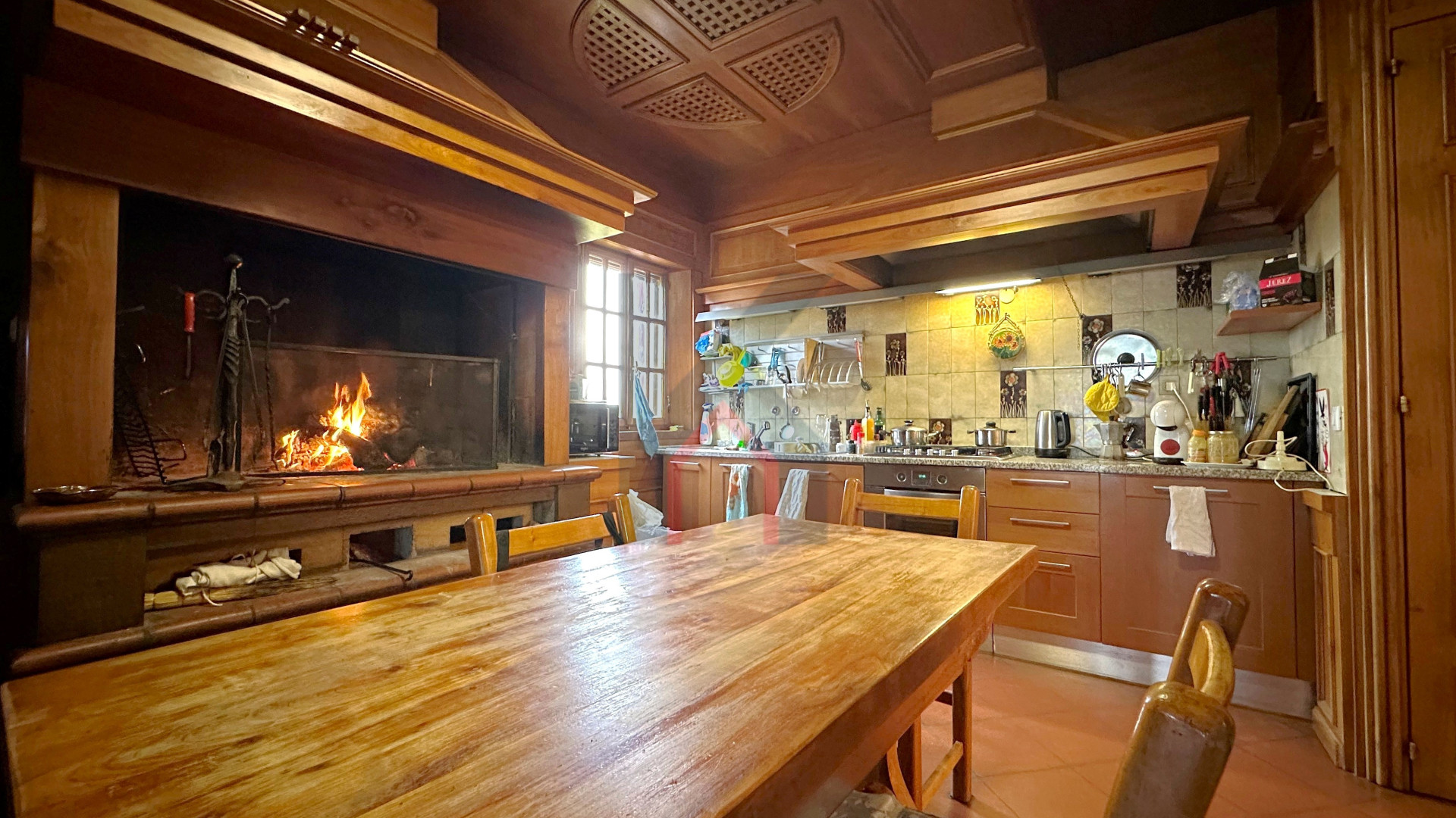 si accede all'abitazione tramite ampio portico chiuso con vetrate e sfruttabile tutto l'anno, ingresso sulla zona pranzo / soggiorno impreziosita da grande camino circolare a centro stanza, cucina abitabile con ulteriore camino in muratura.