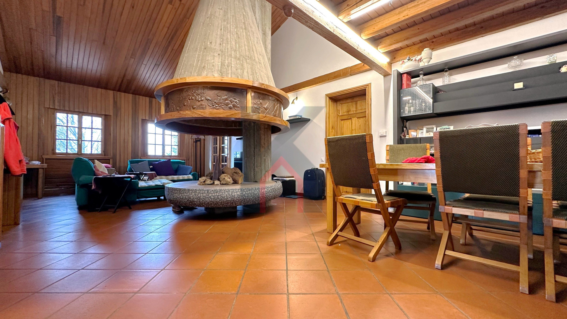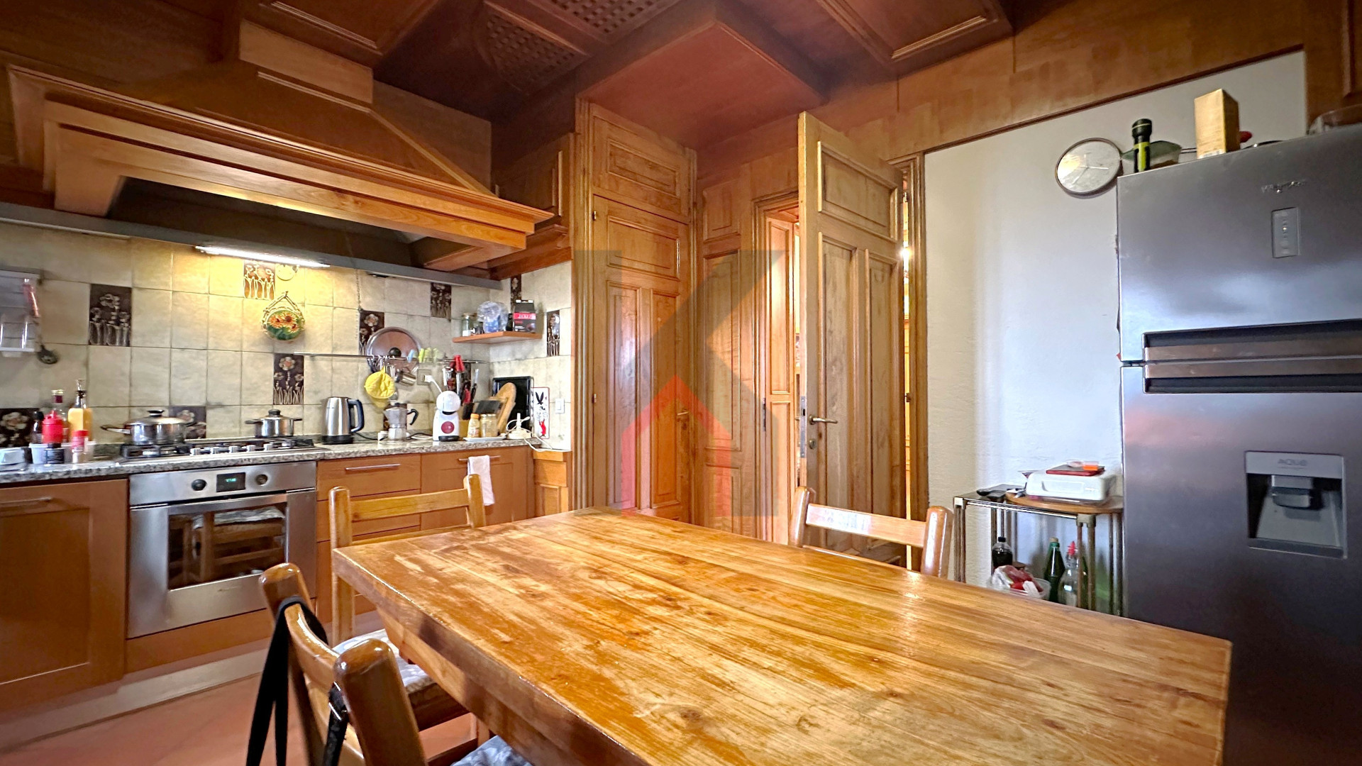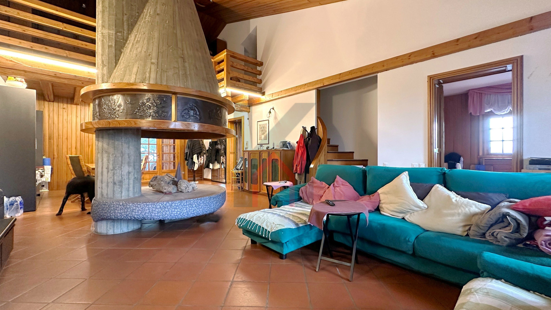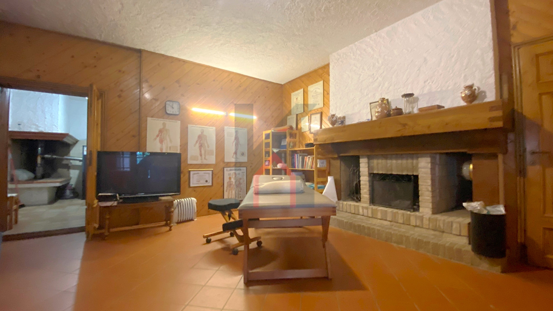 si accede all'abitazione tramite ampio portico chiuso con vetrate e sfruttabile tutto l'anno, ingresso sulla zona pranzo / soggiorno impreziosita da grande camino circolare a centro stanza, cucina abitabile con ulteriore camino in muratura.