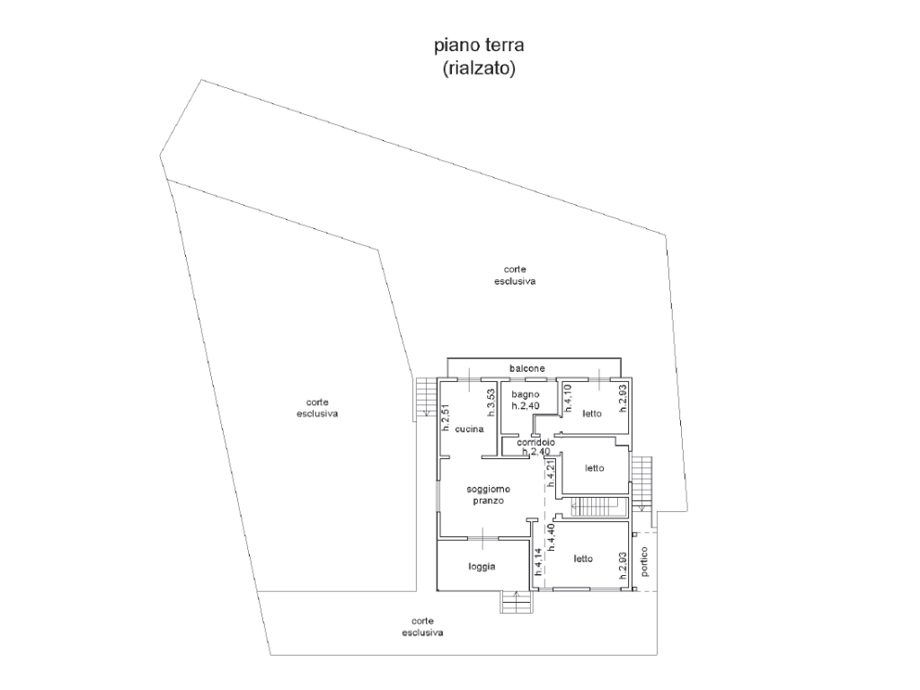 Posta su un lotto di 690 mq è così composta: ingresso su loggia di 14 mq, ampio soggiorno, cucina abitabile con accesso al balcone,