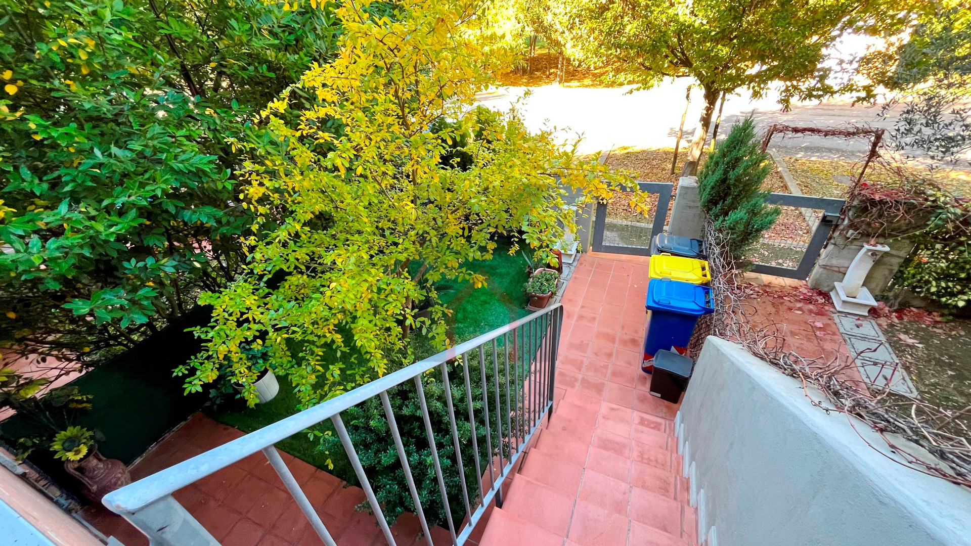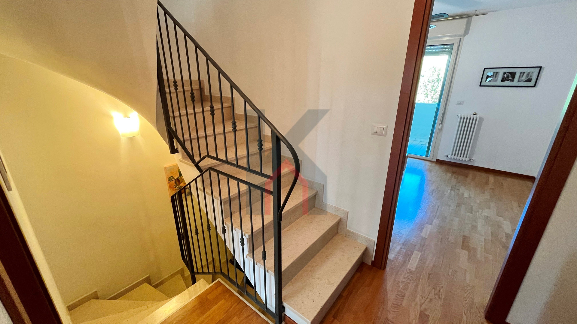 Dal soggiorno mediante comoda scala in muratura raggiungiamo il piano primo composto dal disimpegno, secondo bagno finestrato con vasca, camera matrimoniale e camera singola entrambe con accesso al proprio terrazzo privato.
